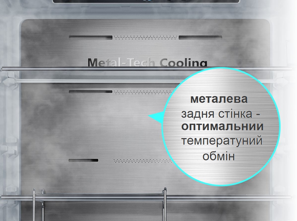 METALLIC COOL Задня металева стінка сприяє кращому теплообміну, а також металевий матеріал утримує температуру довше ніж пластик. В результаті ця система краще тримає холод і температура камери холодильника менше змінюється під час відкриття дверей. Бонусом до цього є ще загально краща економічність. |